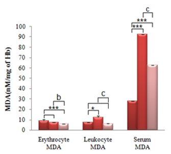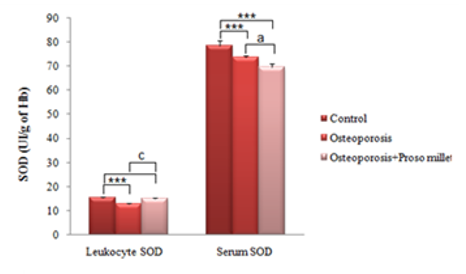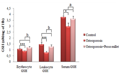 The findings in Figure 1 demonstrate that, in comparison to the control group, the osteoporosis patients' group had considerably greater levels of MDA in their leukocytes (P˂0.05) and serum (P˂0.001) and considerably lower levels of GSH in their erythrocytes (P˂0.001), leukocytes (P˂0.001), and serum (P˂0.001). The aqueous extract of Proso millet therapy resulted in a substantial drop (P˂0.001) in MDA levels in leukocytes and serum and a substantial boost (P˂0.01) in GSH levels in erythrocytes, leukocytes, and serum in comparison to the osteoporosis group (P˂0.05).