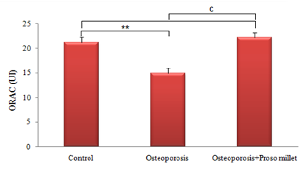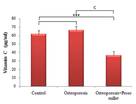 Following the administration of an aqueous extract of proso millet, the osteoporosis patients' group's serum Oxygen Radical Absorbance Capacity (ORAC) level was considerably greater (P˂0.001) than the control group, despite the fact that the ORAC level was considerably lower (P˂0.01) than the control group. Additionally, there was not a statistically noteworthy variance in blood vitamin C levels between the osteoporosis group and the control group (P>0.05) as shown in the Figure 3.