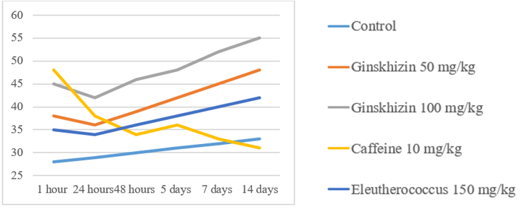 In the running wheel test, animals receiving the combined extract exhibited 25% (50 mg/kg) and 39% (100 mg/kg) increases in time to exhaustion, significantly exceeding the performance of the eleutherococcus group (+15%). While initial running speed during the first 20 minutes was higher in caffeine-treated animals, their performance declined by 30% by the 60-minute mark, compared to only a 12% reduction in "Ginskhizin"-treated groups (Figure 1).
