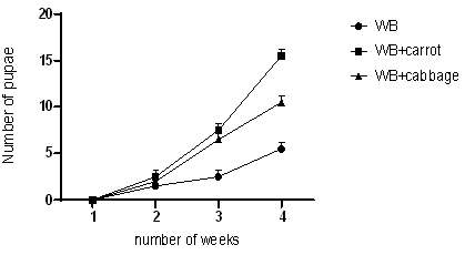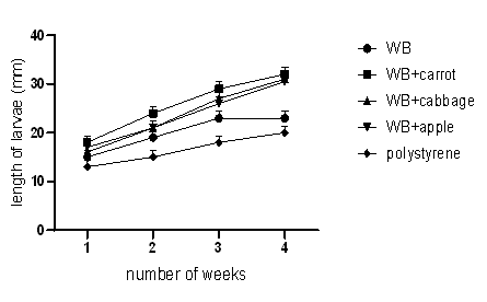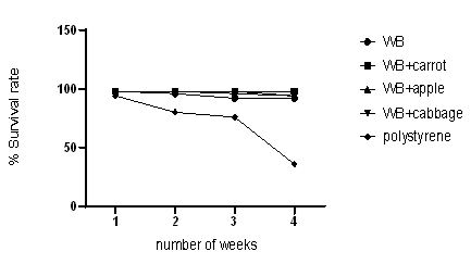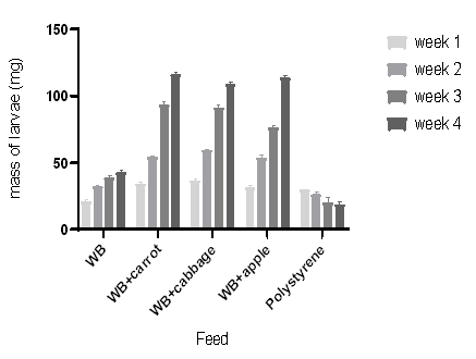 (Figure 1) shows that mealworms fed with polystyrene had the least % survival rate and this was caused by the fact that there is low nutritional value in polystyrene. The groups fed with wheat bran and apple, wheat bran and cabbage, wheat bran and carrots, and wheat bran only had the lowest mortality rates. It was observed that wheat bran supplemented with either a fruit or vegetable had a positive effect on life development as mealworms in these groups increased in weight and length and also had the most accelerated rate of development into pupae and then adults. The choice of feed is crucial as it results in rearing gain; a short life cycle of insects is considered in determining if one is a good farmer or not (Yang et al., 2015). It has also been reviewed that feed also affects the nutritional value of edible insects (Costa et al., 2020).