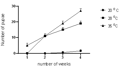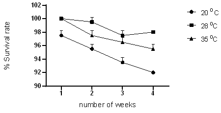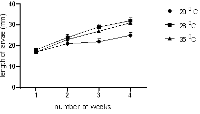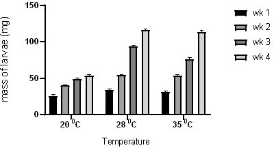 (Figure 2) shows that the optimum temperature for rearing and breeding of Tenebrio molitor in Zimbabwe in the range tested is 28 °C. The results obtained were in line with Xu et al. (2012), who also investigated the optimum temperature for breeding mealworms (Tenebrio molitor) (Xu et al., 2012). At 28 °C, mealworms had the highest survival rate of 98 %, the highest average weight of 117.5 mg, and the highest average length of 33 mm. Generally, insects have different adaptations to survive when exposed to low temperatures. One of the ways is water loss (Orkusz, 2021) and in this present study, the group of mealworms bred at 20 °C delayed developing into pupae, which could be a result of water loss.