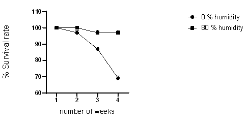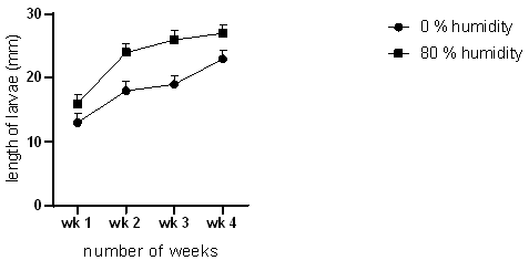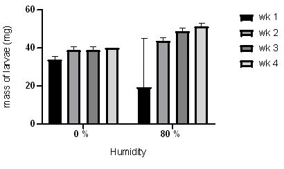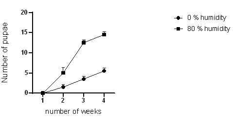 Mealworms were reared in the absence of humidity and at 80 % humidity, and results are shown in (Figure 4). At 80 % humidity mealworms grew and developed better than in the absence of humidity.