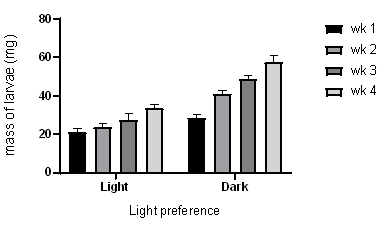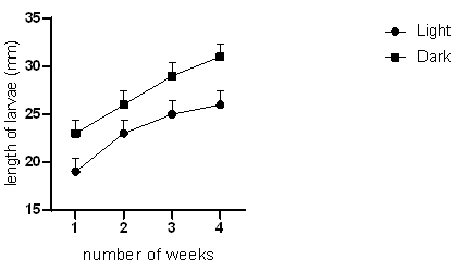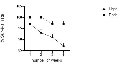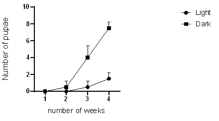 Mealworms were reared in the presence and absence of oxygen and the results are shown in (Figure 3). The results show that mealworms grow, develop, and survive better in the presence of light than in the absence of light.