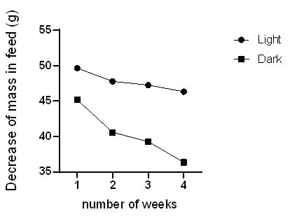 The feeding rate of mealworms from the two groups (absence of light and presence of light) was also determined by measuring the feed consumed on weekly basis.