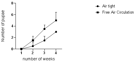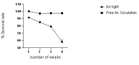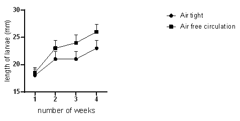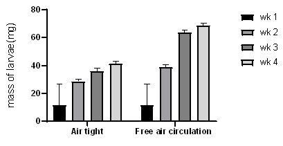 Results from this study showed that oxygen is an important factor in the efficient breeding and rearing of Tenebrio molitor mealworms (Figure 3). There was a high mortality rate in the group of mealworms reared in an air-tight container compared to the group of mealworms that were reared in a well-ventilated space.