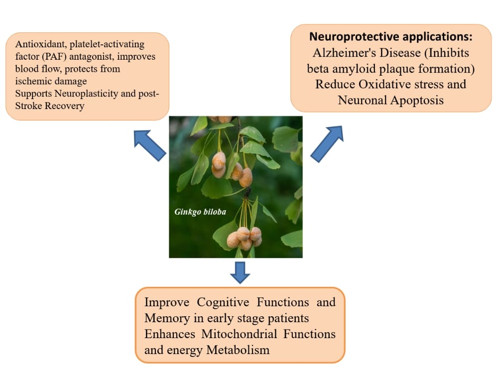 Research through meta-analysis confirmed that ginkgo biloba extract leads to improved cognitive performance in patients with vascular cognitive impairment, although researchers could not determine its effectiveness in the treatment of Alzheimer's Disease patients treatment. Both donepezil medication and ginkgo preparations work toward treating Alzheimer's disease, although they belong to different treatment classes (Li et al., 2023). Medical effects of Ginkgo result from two main active metabolite groups, which include Ginkgo flavones (with quercetin, kaempferol, and iso-rhamnetin glycosides as the principal flavonoids plus biflavonoids ginkgetin/isoginkgetin) and terpene lactones (ginkgolides A, B, C, and J and bilobalide). Pharmacologically active standardized ginkgo leaf extracts are commercially available in the market. The medicinal effects of ginkgo leaf extracts depend on the combined antioxidant capabilities of ginkgolides and the ability of flavonoids and terpenoids to scavenge radicals and suppress platelet-activating factors, and improve blood flow while decreasing platelet aggregation. Scientific evidence suggests that flavonoids protect against the damaging effects of oxidation on lipid membrane structure (Bosch-Morell et al., 2020).