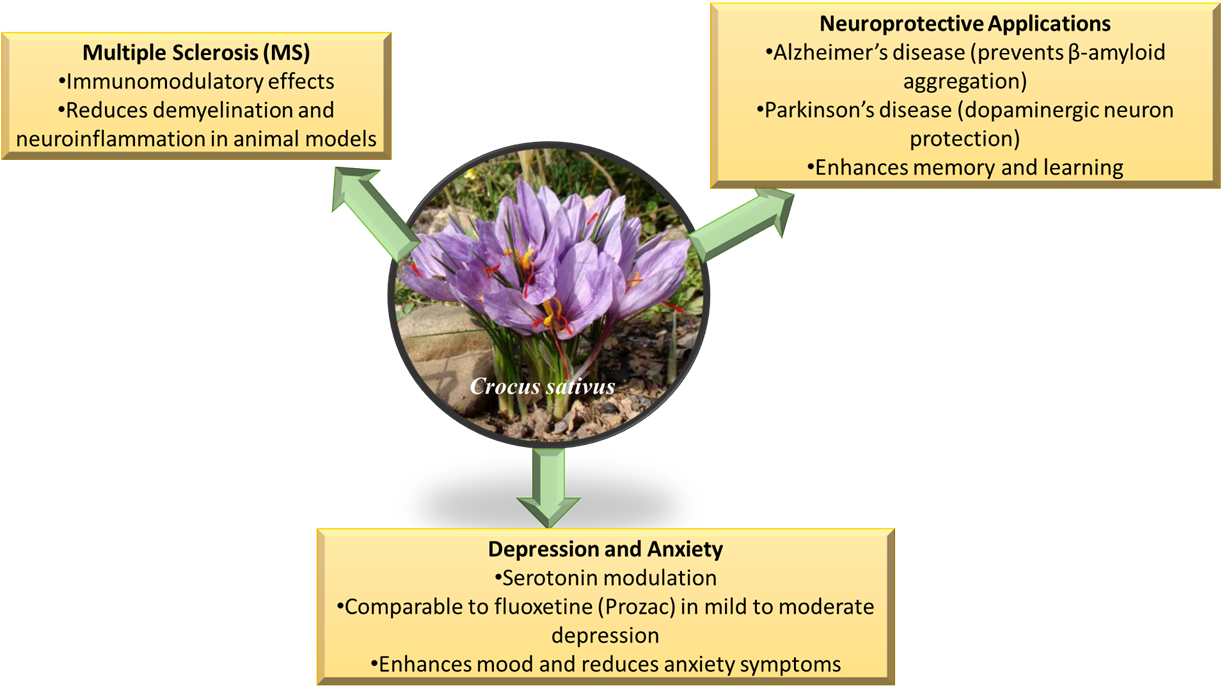 Crocus sativus L. stands out among therapeutic plants because of its increasing popularity. Crocus sativus L. belongs to the Iridaceae family and grows throughout Greece, Italy, Spain, Israel, Morocco, Turkey, Iran, India, China, Egypt, Mexico, and other regions. The purpose of this research focuses on the neuroprotective functions of Crocus sativus L., especially in treating Parkinson's disease and Alzheimer's disease. The metabolic redox reactions in cells generate unavoidable byproducts known as reactive oxygen-nitrogen species, and together they are designated as reactive oxygen-nitrogen species. These species are produced during phagocytosis, oxidative phosphorylation in the respiratory chain of mitochondria, eicosanoid synthesis, and redox reactions that involve metals with variable valence and biotransformation reactions of exogenous and endogenous substrata in endoplasmic reticulum cells (D’Onofrio et al., 2021; Aruta et al., 2023; Gurubasajar et al., 2023; Bergeron et al., 2024; Naseri et al., 2024). Saffron or Crocus sativus has existed as a color and flavoring agent and medicinal herb since the beginning of human civilization. Scientists continue to identify emerging research that demonstrates the pharmacological benefits of saffron alongside its key compounds for CNS therapy applications. Crocus sativus L. has neuroprotective effects on Alzheimer's disease (AD) patients' cognitive impairment. Reviewing the data and mechanisms underlying saffron-induced therapeutic effects and quantifiable cognitive advantages in AD is the aim of this study. Studies that were preclinical and clinical were found. These criteria were used to choose preclinical in vitro and in vivo studies: 1) creation of the pharmacological profile of saffron on biological or biophysical endpoints; 2) assessment of saffron effectiveness using animal screens as an AD model; and 3) studies lasting at least three months that show that crocin seems to be able to control glutamate levels, lower oxidative stress, and modify tau and Aβ proteins. Research investigates how saffron functions as a neuroprotective agent in age-related macular degeneration (AMD) cases (D’Onofrio et al., 2021; Al Hemaidi, 2024). Medical evidence from pharmacological studies demonstrates that saffron supplementation therapy protects the brain through various scientific investigations that link its therapeutic properties to crocins, crocetin, picrocrocin, and safranal compounds. Studies indicate that saffron carotenoids serve as the primary source of antioxidant properties based on the evidence throughout most research. The capacity of saffron metabolites enables them to bind to biomolecules that protect them against free radical damage (Figure 3).