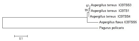 Four fungal strains were isolated from the soil sample collected from the agricultural land. The micromorphological characters were studied (Figures 1 and 2) and compared with the standard fungal taxonomical keys for identification. Morphological identification of A. terreus strains was based on colony appearance and color, like coffee with an arrangement of biseriate conidial heads in a columnar shape. A. terreus though was isolated from different substrates but its identification was based on its microscopic and macroscopic characteristics (Afzal et al., 2013) which produced alike morphological characteristics. Identification of A. terreus samples through molecular markers substantiated with identification of other A. terreus species using morphology thereby exhibiting 100% similarity with A. terreus (Table 1). The genetic distance between the three A. terreus species was found to be 0.7% (Table 2). The phylogenetic study revealed all the study fungi samples were clustered in one clade (Figure 3). Furthermore, the efficiency of molecular markers can be proven with the phylogenetic studies of other researchers (Varga et al., 2007; Samson et al., 2011) where their findings presented A. terreus as a distinct clade, separated from other Aspergillus species.