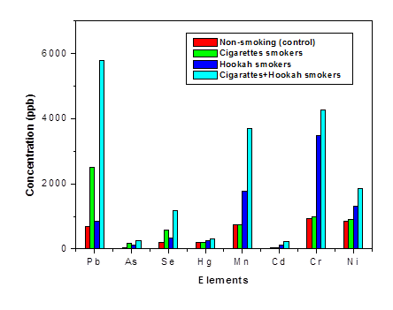 The impact of age and smoking period on element concentrations was investigated. We did not find any clear relation between the concentrations of heavy metals that influence age and smoking periods. However, further work is required in this area to clarify previous findings. Comparison for the average of each element in the four groups (non-smokers, cigarettes smokers, hookah smokers, and cigarettes+ hookah smokers) was performed as shown in Figure 1.